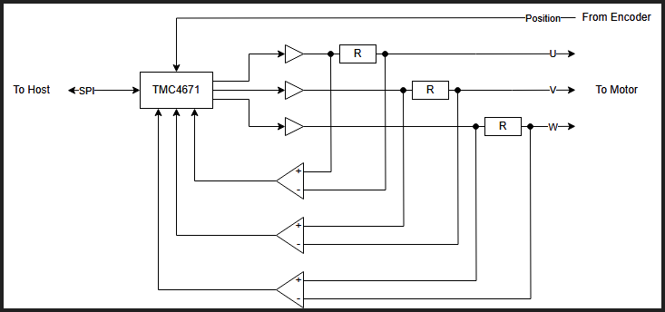 Die Verstärkung der Spannung über die Strommesswiederstände wurde versucht selbst zu Implementieren. Die Implementierung lässt allerdings zu viel von dem PWM-Signal durch, wodurch die Messung unbrauchbar ist. Dadurch ist es nicht möglich die PID-Regler für d und q zu verwenden. Da die Architektur des TMC4671 den Geschwindigkeits-PID-Regler fest mit dem q-PID-Regler verdrahtet ist es allerdings auch nicht möglich die Geschwindigkeits-Regelung zu benutzen. Als workaround werden p und q direkt vom Host gesetzt. Die Regelung wird dabei auf den Host ausgelagert und benutzt einen PID-Regler um die Geschwindigkeit direkt mit dem q-Wert zu regeln.