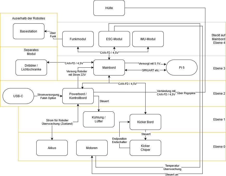 Normale Kästchen stehen für eigene Module bzw. Platinen, die aktuell in Entwicklung sind. Unten befindet sich eine Übersicht mit den zuständigen Personen sowie der groben Funktionalität der einzelnen Module. Die Überschriften führen direkt zu den detaillierten Beschreibungen der jeweiligen Module.