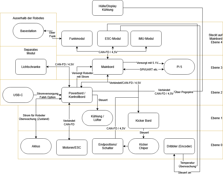 Normale Kästchen stehen für eigene Module bzw. Platinen, die aktuell in Entwicklung sind. Unten befindet sich eine Übersicht mit den zuständigen Personen sowie der groben Funktionalität der einzelnen Module. Die Überschriften führen direkt zu den detaillierten Beschreibungen der jeweiligen Module.