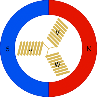Das obige Bild zeigt ein Simples Model eines BLDC Motors. Zu sehen ist der Rotor, welcher aus zwei Magneten besteht1 und der Stator, welcher die Spulen U, V und W beinhaltet. Ein Motor kann auch mehr Spulen und Magneten haben. Die Anzahl der Spulen ist dabei allerdings immer ein vielfaches von 3 und die Anzahl der Magneten ein vielfaches von 2. Zu beachten ist, dass die Spulen in der Mitte Sternförmig verbunden sind. Alternativ können die Spulen auch in einer Delta Konfiguration verbunden werden. Elektrisch macht das keinen Unterschied. Eine Rotation des Motors wird durch einen durch die Spulen fließenden Strom erzeugt.