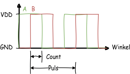 Die Signale A und B geben also versetzte Pulse. Die Drehrichtung kann dabei durch die Reihenfolge der Pulse ermittelt werden. Kommt der A-Puls vor dem B-Puls, dreht der Encoder in Positive Richtung. Kommt der B-Puls jedoch vor dem A-Puls, dreht der Encoder in entgegensetzte Richtung.