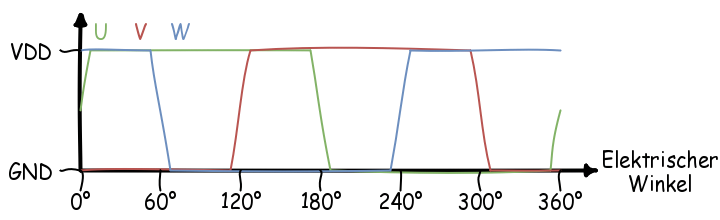 Es werden drei Signale (U, V und W) verwendet:
