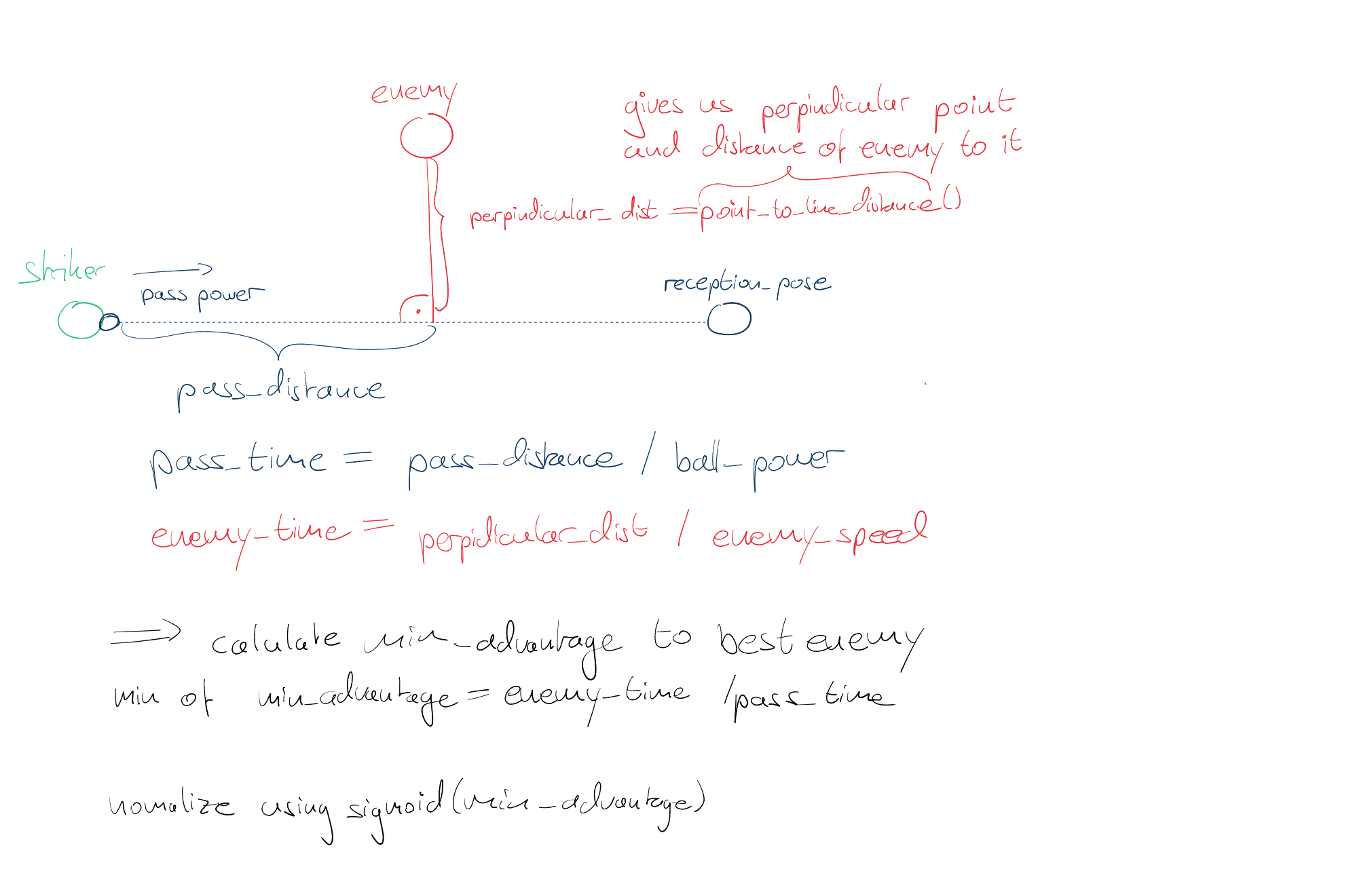 Über point_to_line_distance() bekommen wir den Lotfusspunkt und Distanz zu diesem vom Gegner zur Passlinie im Tupel. Darüber können wir die Zeit jedes Gegners zu dem Abfangpunkt berechnen, durch die Distanz zum Lotfusspunkt durch Gegner-Geschwindigkeit. Diese wird für jeden Gegner errechnet und für jeden Gegner ein relativer Wert der Passzeit zum Lotfußpunkt im Verhältnis zur Abfangzeit berechnet. Von diesen Werten wird sich der geringste Wert gemerkt (min_advantage) die unseren geringsten Zeitvorteil zum Gegner merkt.