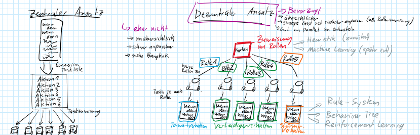 Aus den genannten Anforderungen wurde eine neue Architektur abgeleitet, die die erkannten Probleme beheben soll. Diese werden im nachfolgenden Bild dargestellt. Links ist dabei das Rule-System bei dem anhand einer umfangreichen Taskliste für jeden Roboter ein Task bestimmt wird. Der Ansatz rechts zeigt einen Vorgang, bei dem zunächst Roboter zu verschiedenen Rollen zugewiesen werden, wie z.B. Angreifer, Torwart, Verteidiger. Im Anschluss werden diese von einem kleineren Rule-System oder ähnlichem gesteuert, welches jedoch übersichtlicher ist, da es sich auf das Verhalten einer einzigen Rolle begrenzt. Außerdem sind dabei alle Roboter bekannt, die ebenfalls dieselbe Rolle zugewiesen bekommen haben, sodass die Roboter auch gemeinsam kooperieren können.